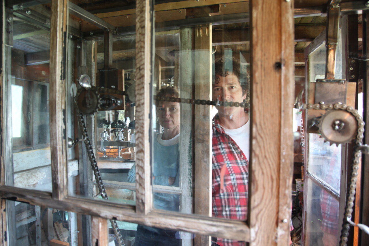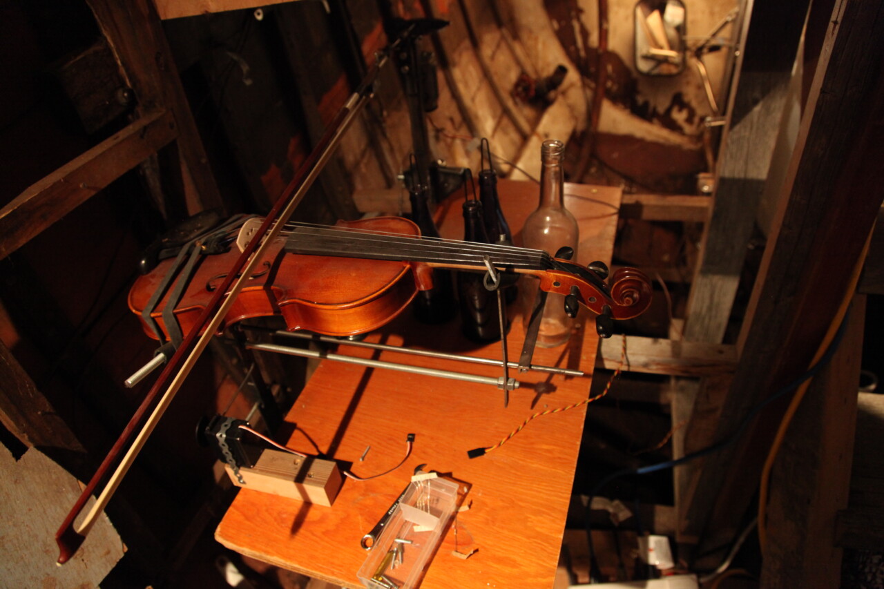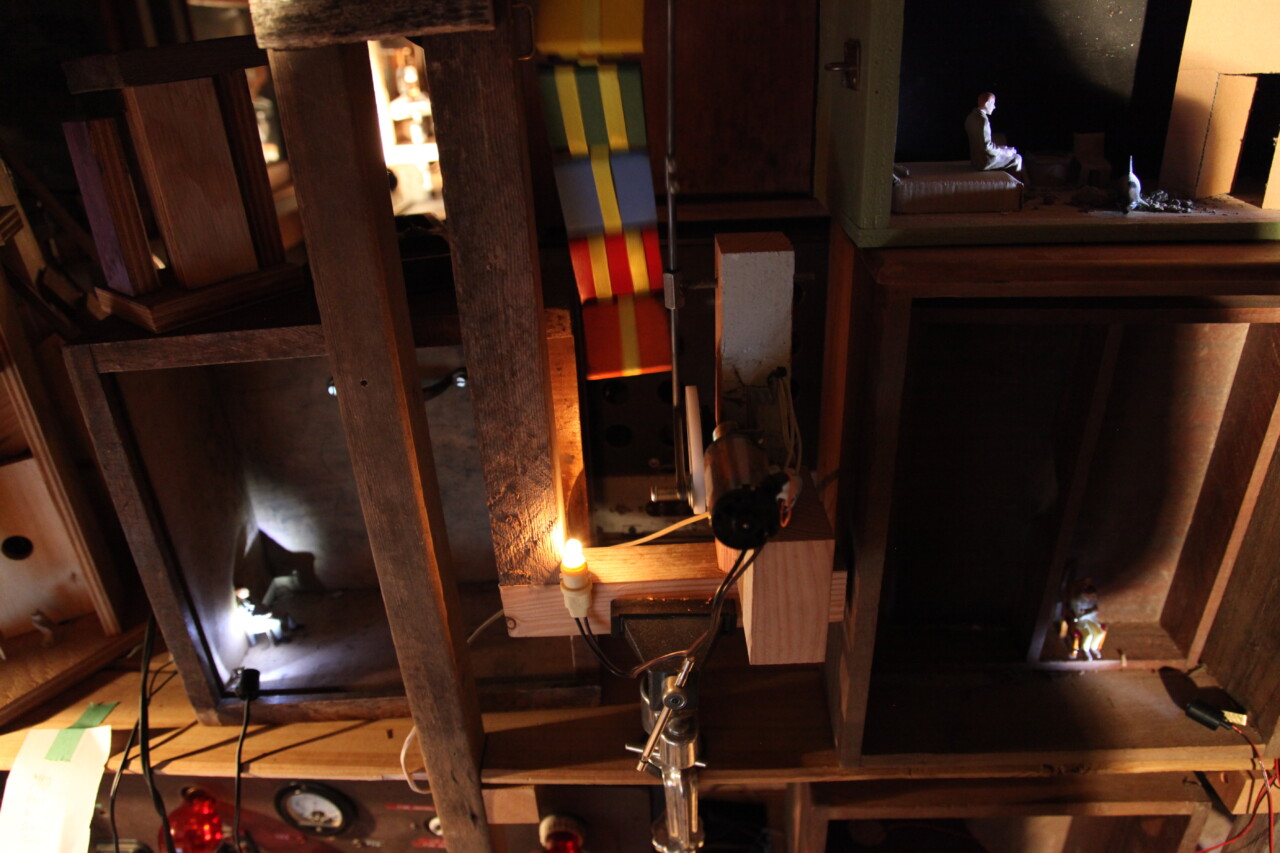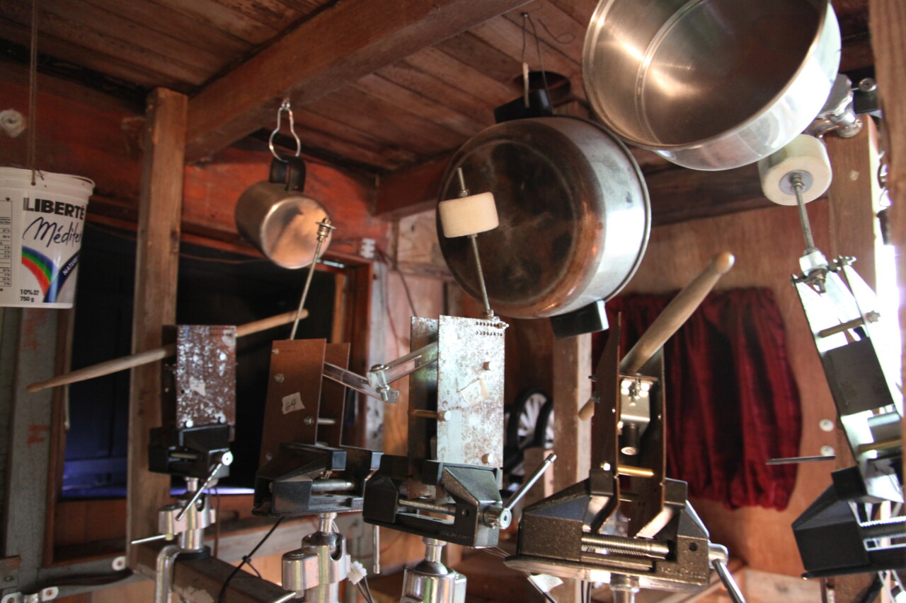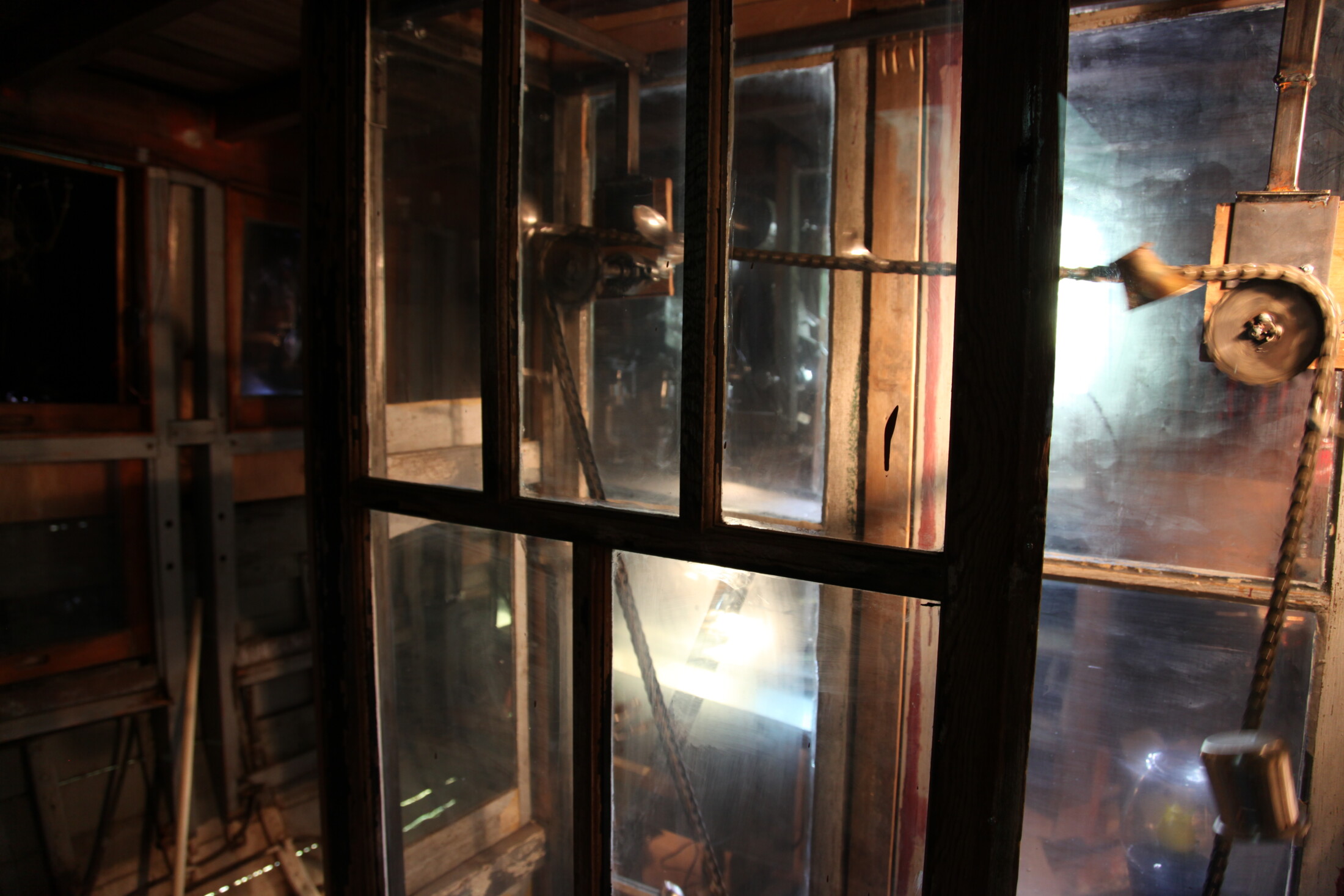 Viewers enter the cabin of Cardiff and Miller’s creation to encounter a maze filled with playful yet foolish contraptions. It is as if you have entered an underground workshop for nonsense existing in an alternative universe. Sounds and shifting lighting enhance this atmosphere. The objects /experiments that occupy the cabin are more than a reflection of the traveler’s obsessions; they are an escape route for the viewer into a forgotten world.