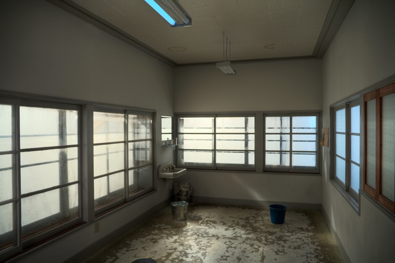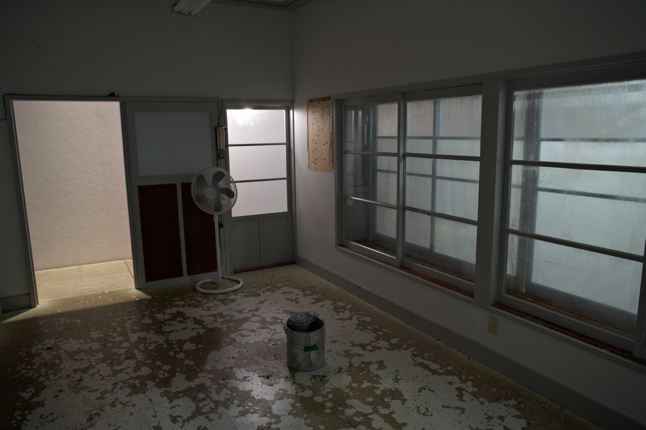 A computer controls the flow of water, the lights, the strobes, and the fans, etc. An ambisonic sound track plays through 8 hidden speakers and 2 hidden subwoofers. The piece begins as the storm approaches, with no water hitting the windows, then proceeds to the incredibly loud, floor shaking climax. As the storm dissipates the sound of someone moving and coughing in the next room is heard and then the piece starts again. This work was created in a deserted dentist’s office in a traditional Japanese house near the city of Tokamachi, Japan as part the Echigo Tsumari Art Triennial 2009.