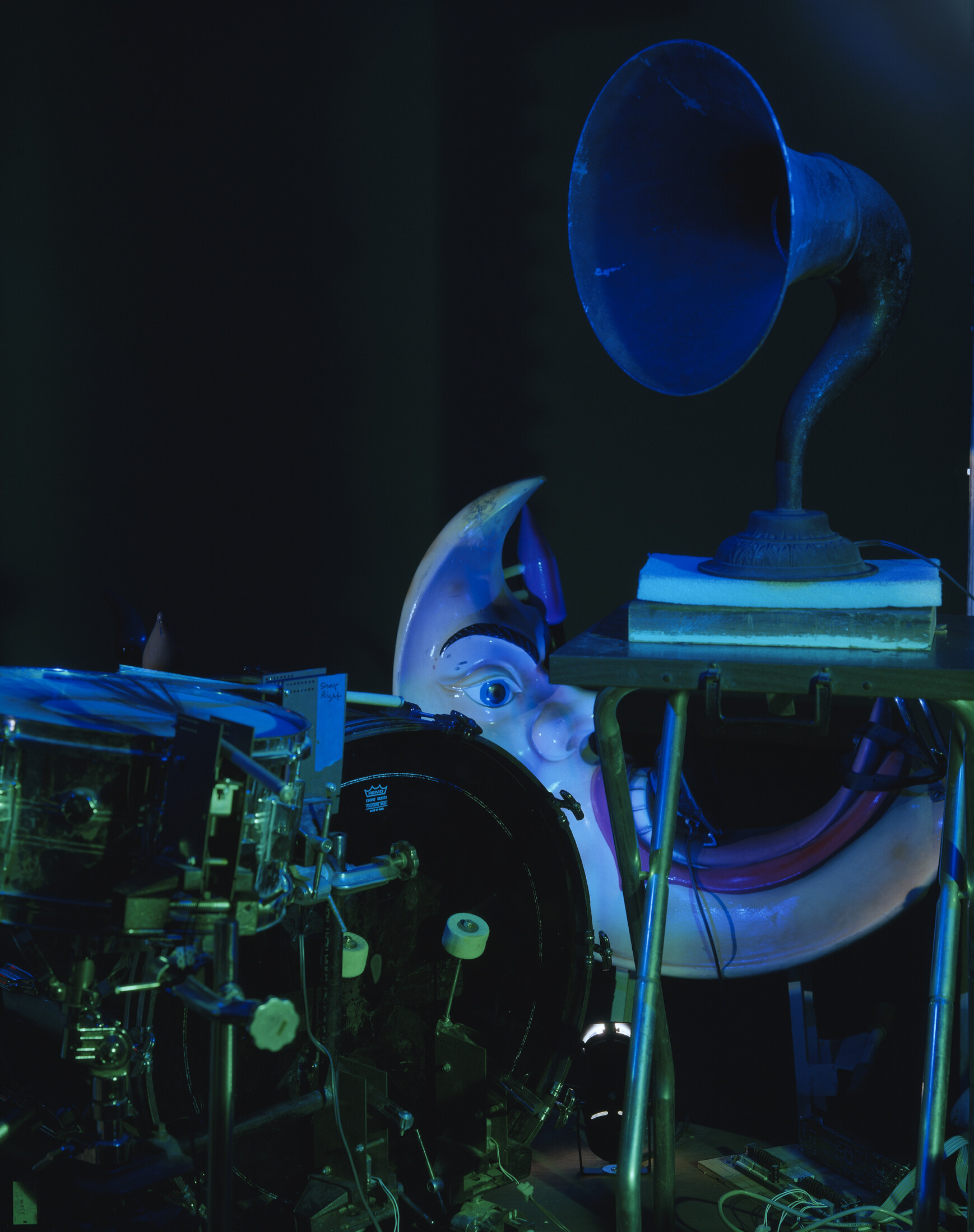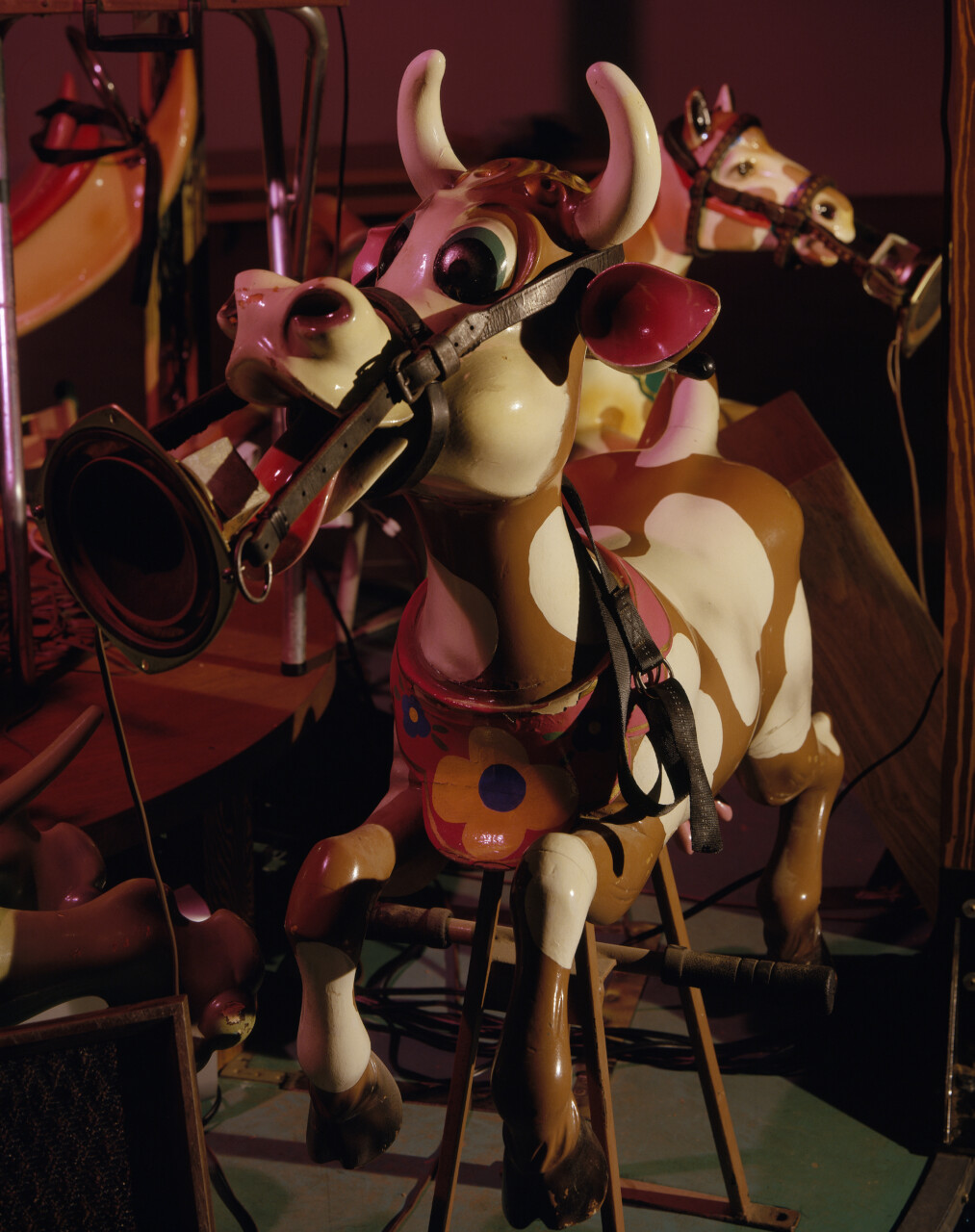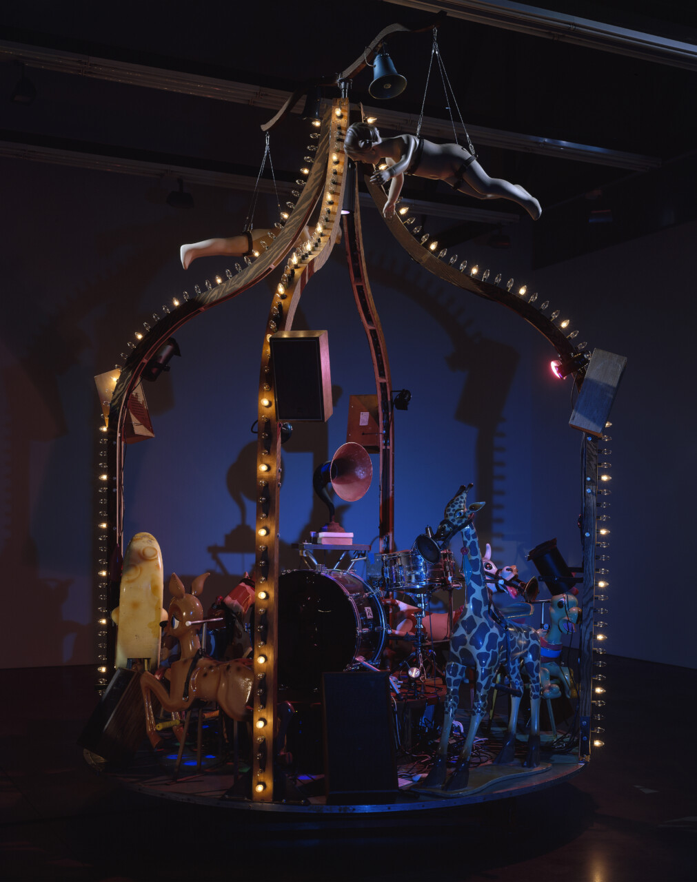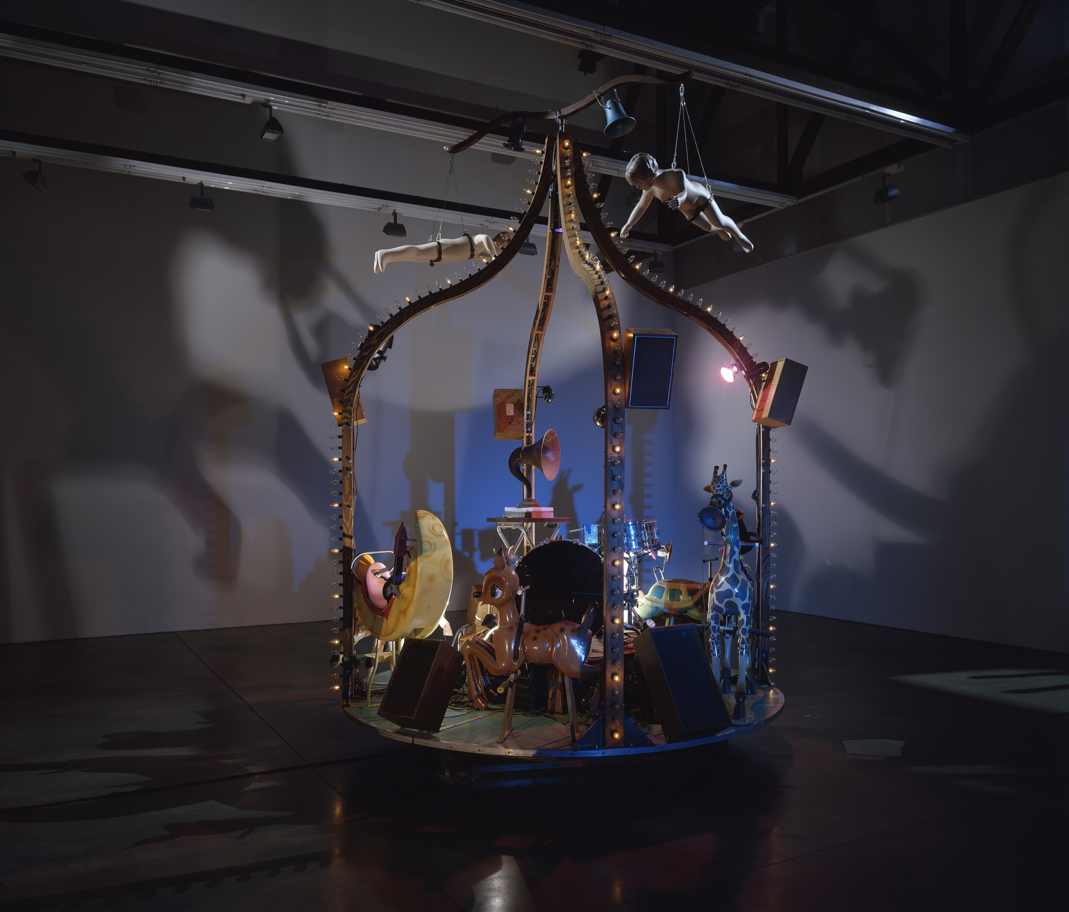 The Carnie, combines the artists’ interests in spectacle, narrative, and sculptural sound. A small children’s’ carousel is activated by a start button. It grinds slowly up to speed, while lights and music emanate from the structure and moving shadows are cast onto the walls. The musical source is deconstruced and relocated throughout the structure of the carousel so that the movement of the sound occurs horizontally as well as vertically. The results transform the carnival ride into a layered and evocative encounter.