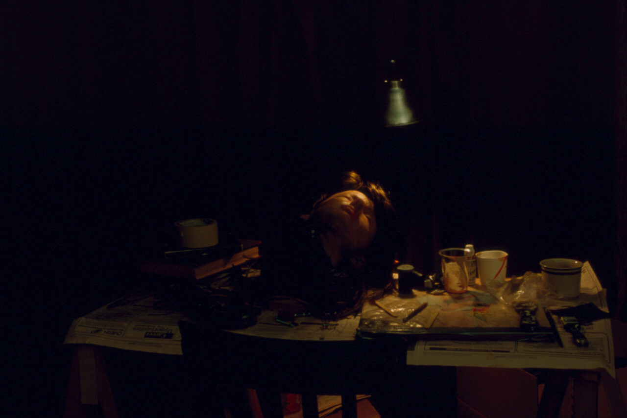 Martin Janda invited us to do an exhibition in his space in Vienna. We decided to experiment with combining an installation with an audio walk. We strung a multitude of curtains to make a labyrinth of hallways, and then situated a revolving loud speaker, a miniature house, and a table, on which there were books, electronics, and a latex rubber head cast from my face.
