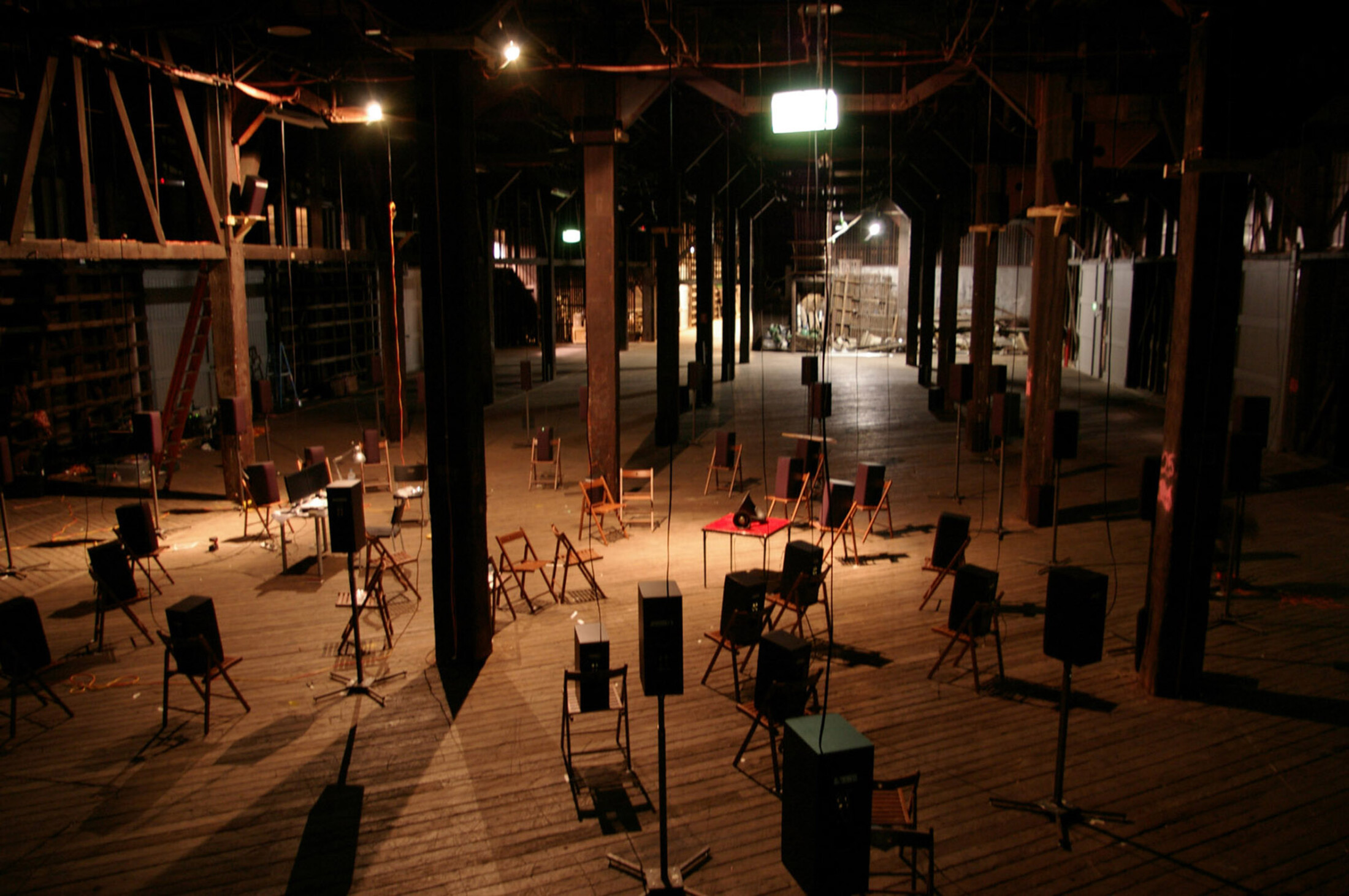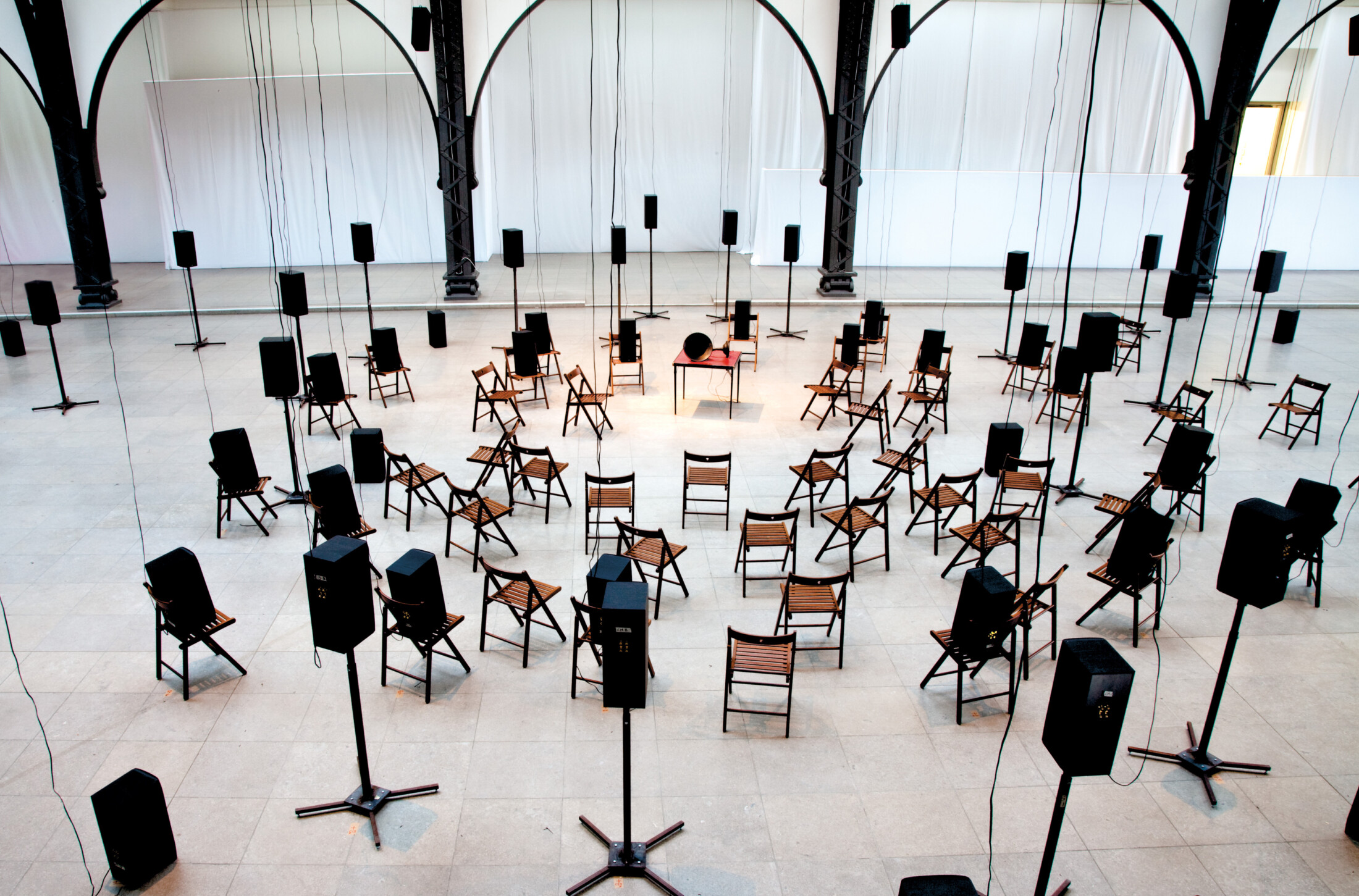 This large installation, ‘The Murder of Crows’, continues Cardiff Miller’s explorations in creating sculptural and physical sound. Ninety-eight audio speakers are mounted around the space on stands, chairs and the wall creating a minimalist flocking of speakers. The structure of the piece tries to mirror that of the illogical but connected juxtapositions that we experience in the dream world. One soundscape moves into another with an electronic dreamscape composition shifting into sound effects such as factory noises, crashing waves or birds wings and then into a guitar and strings composition then into a choir sequence and marching band.
