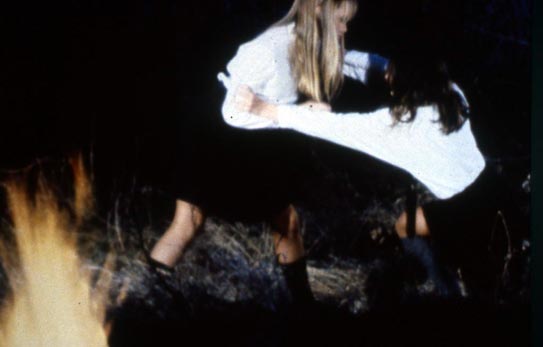 she runs past, onto the boards, scuffling starts, there are wrestling sounds as two people push each other around. there is the sound of a plank getting pushed and knocked off the blocks. I stop, wait, and then start walking again