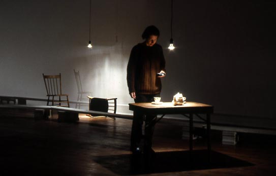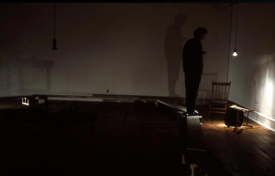 I decided that I would try to use the concepts of a walk for a gallery space. We were renting a large studio in Montreal at the time so I produced it there, using some of the cinderblocks and scaffolding planks that were scattered around the neighborhood. I felt that I needed a route or path, so I set up the planks in the studio to create a circuit. In the various galleries where this piece has been exhibited, we would just rent scaffolding and buy cinderblocks and remount it