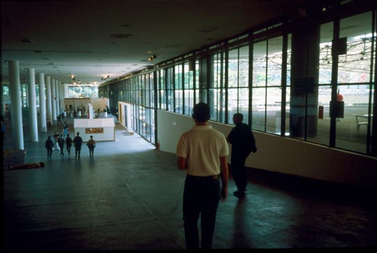 | The Bienal building, a large futuristic cement warehouse with glass floor to ceiling windows, was a perfect site for a sci-fi story. There are three characters in this narrative: Janet (my voice), Drogan (George), and the Machine voice (a slowed-down woman’s voice). It is about a character named Drogan and a woman that discovers him in a warehouse strapped to a bed controlled by machines. (The title and characters were taken from a short story written by George in the 1980s.)