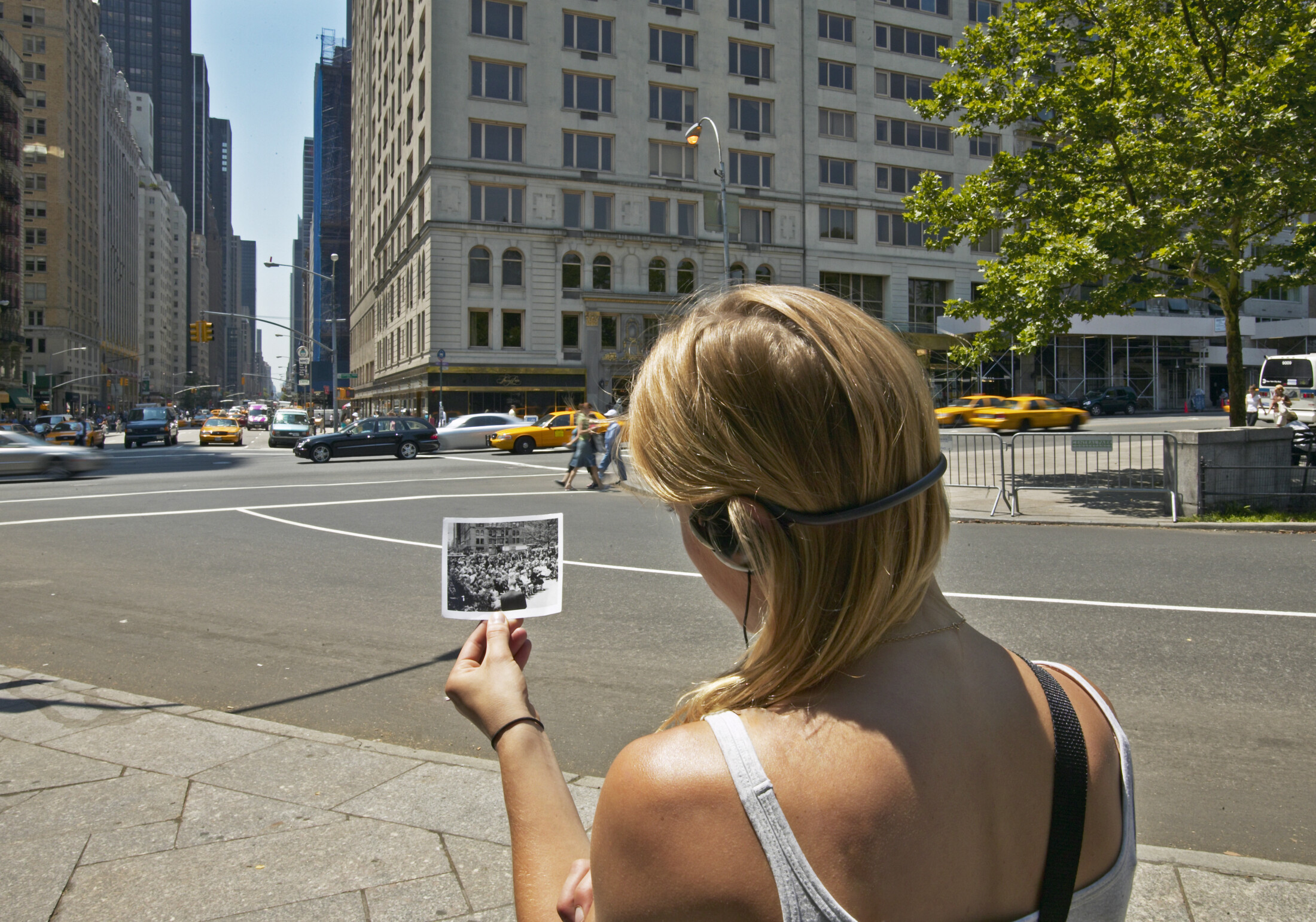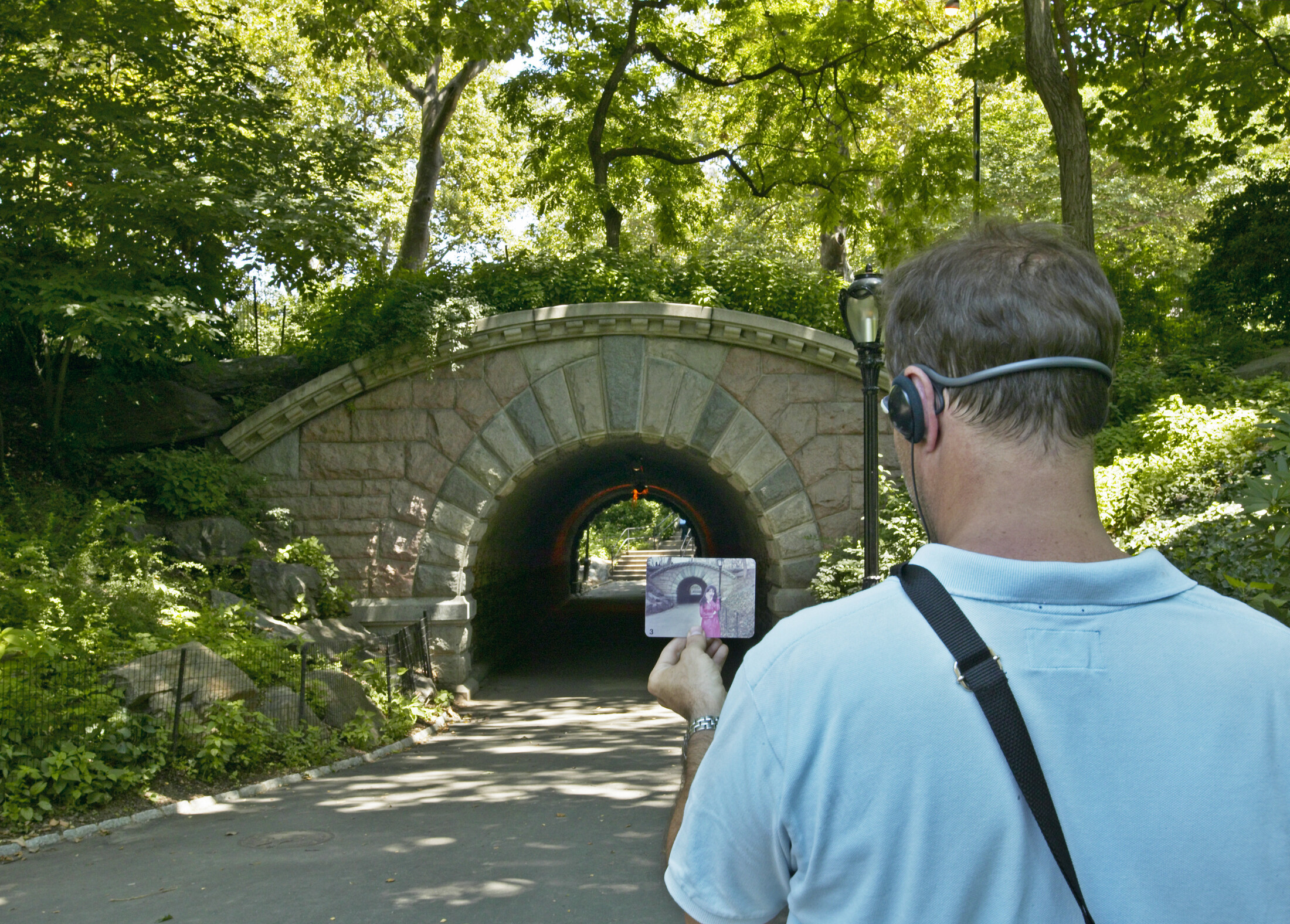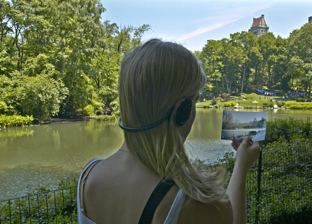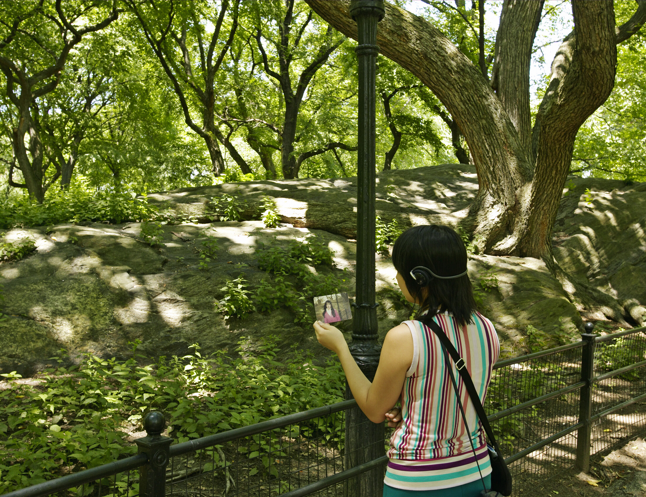 Relayed in Janet Cardiff’s quasi-narrative style, Her Long Black Hair is a complex sensory investigation of location, time, sound, and physicality, interweaving stream-of-consciousness observations with fact and fiction, local history, opera and gospel music, and other atmospheric and cultural elements. The walk echoes the visual world as well, using photographs to reflect upon the relationship between images and notions of possession, loss, history, and beauty. As Cardiff’s voice on the audio soundtrack guides listeners through the park, they are occasionally prompted to pull out and view one of the photographs. These images link the speaker and the listener within their shared physical surroundings of Central Park, shifting between the present, the recent past, and the more distant past.