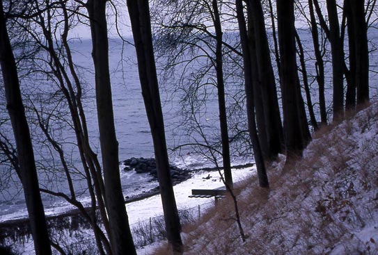 start to hear accordion music … crows in trees to right. Accordion player walks around listener Janet Let’s stop and listen, close your eyes, trust me. Janet I have the postcard of this place that he sent me years ago. Things have changed a lot. The grass is long now, coming up through the stones on the walk here. The building in front of us is gutted, the windows broken, skylights caved in, the brick walls singed by smoke. The sculptures are covered with graffiti. The old house is still standing, partially protected by the razor wire fence around it I guess. Someone’s cooking something. Smells like burnt meat. George whispers in left ear All I could see on the video was you walking along this path but I couldn’t see in front of you, to see what was to come. walking sound, sound of explosions, seagulls … then silence Janet We’re back. It’s like the picture again, beautiful green lawn. People walking around, sound of birds someone’s giving a lecture. Let’s stop and listen. sound of museum tourguide lecturing about Moore sculpture talking about its solidity and how the figures are trapped in time. she talks about Moore saying that sculpture is like a journey. after you’ve walked around it, your view has changed Janet One simple action can change things so much. If only I hadn’t looked out to sea right at that particular point. George whispers in left ear I think we should try it one more time. Janet He’s with us, trying to find that precise moment, lost in the particles on the videotape. |